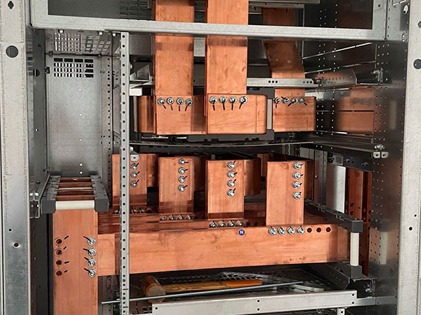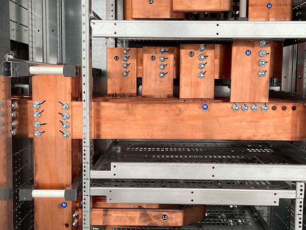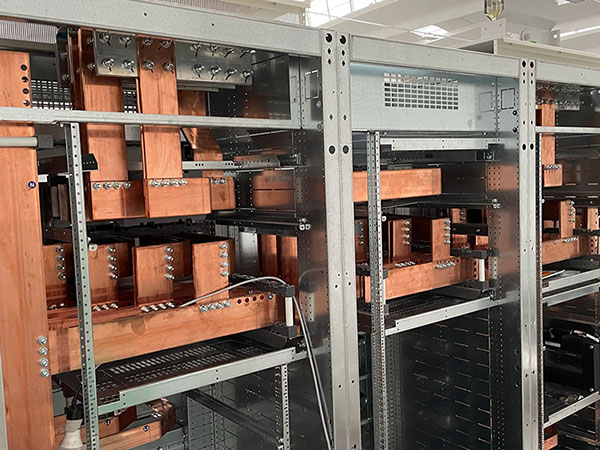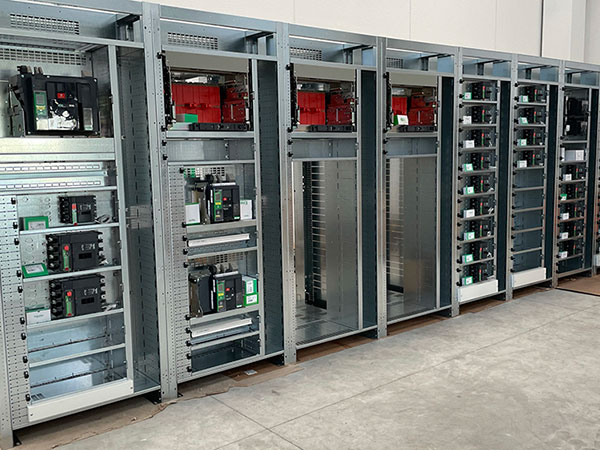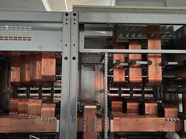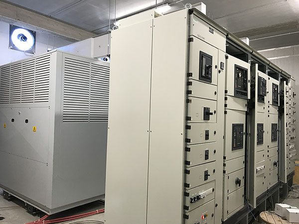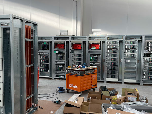 Cabina trasformazione MT/BT al servizio della linea estrusione Pressa P1. Cabina con due trasformatori 20/0.4KV da 2000KVA ognuno. Quadro BT Cabina trasformazione MT/BT al servizio della linea estrusione Pressa P1. Quadro con due sezioni da 3200A ognuna e congiuntore.